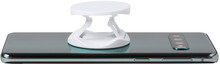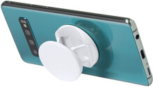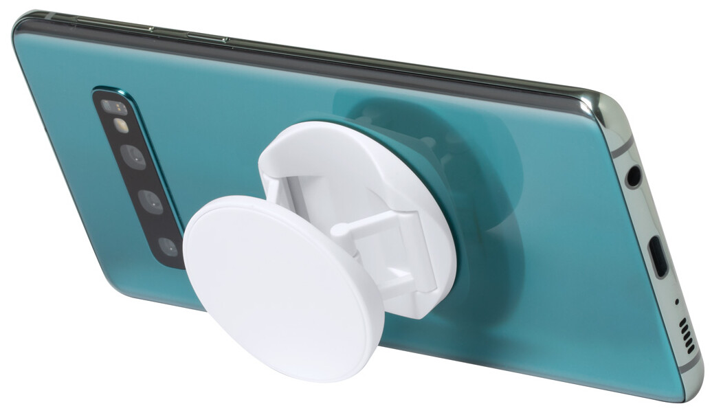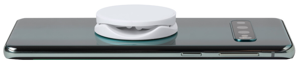 Kulatý, plastový stojánek na mobil s kroužkem na prst se samolepící stranou.