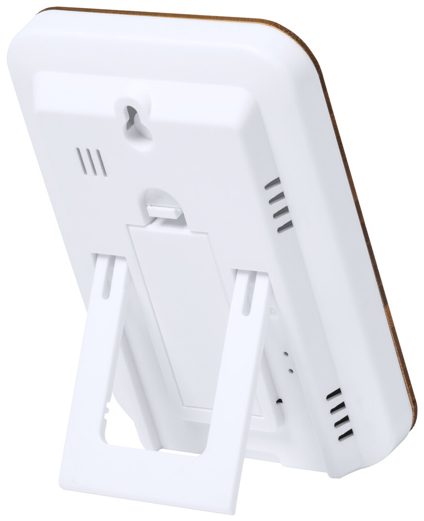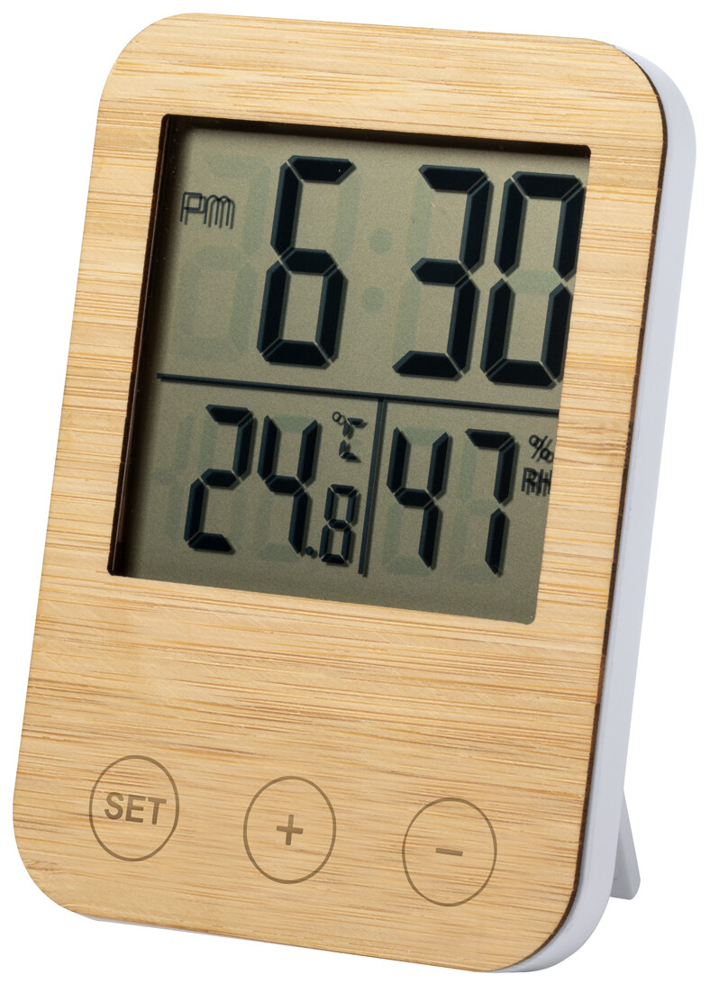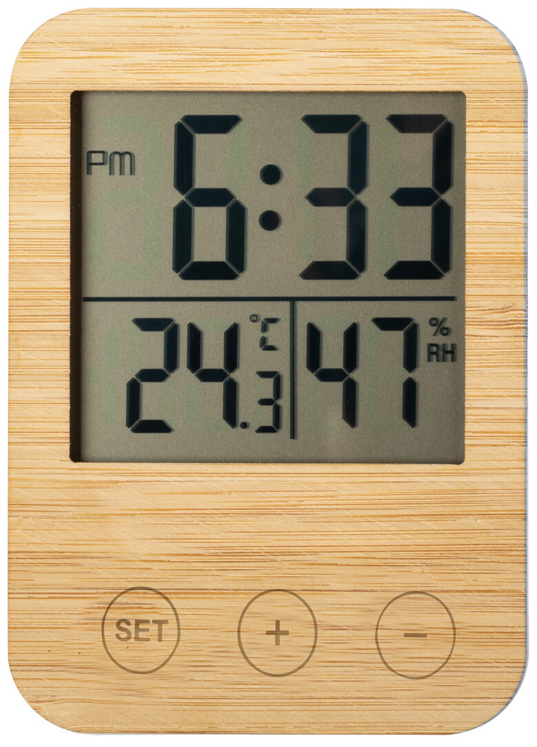 Bambusové digitální hodiny a meteorologická stanice s displejem teploty a vlhkosti. Pracuje se 2 AAA bateriemi, bez baterií.