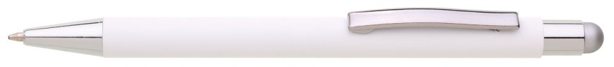 Bílá kovová propiska se stříbrným touch koncem. Logo po vylaserování je v barvě touch – leskle stříbrná.