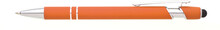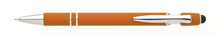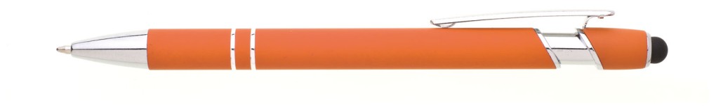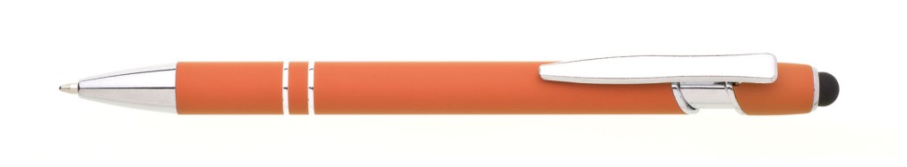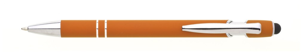 Propiska s touch koncem, měkkým pogumovaným soft povrchem v oranžové barvě a stříbrnými doplňky včetně dvou ozdobných kroužků. (NATIO)