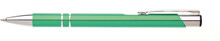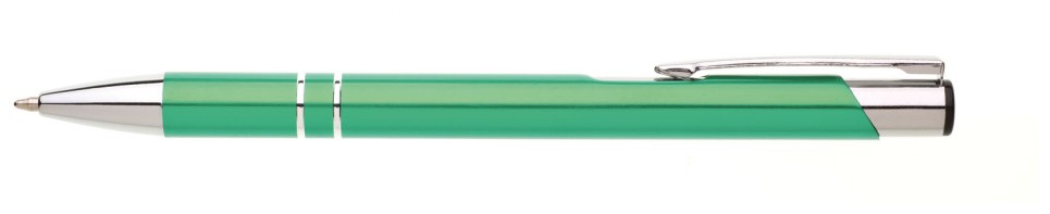 ORIN je velmi oblíbená hliníková reklamní tužka. Lesklé, světle zelené tělo se dvěma stříbrnými proužky a chromovými doplňky. Velkoobsahová modrá náplň.
