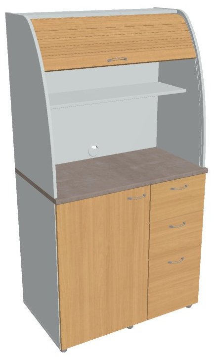 Dvě police ve vrchní části kuchyňky poskytují dostatečnou kapacitu pro vaše skleničky, hrnky či talíře. Na pracovní desku můžete umístit např. kávovar a kabelovou průchodkou v zadní části vyvedete přívodní kabel z prostoru kuchyňky.