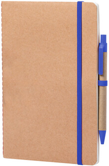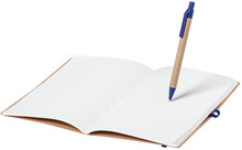 Blok A5 z recyklovaného kartonu s 60 čistými listy a barevnou gumičkou. Včetně plastového kuličkového pera z pšeničné slámy s modrou náplní.