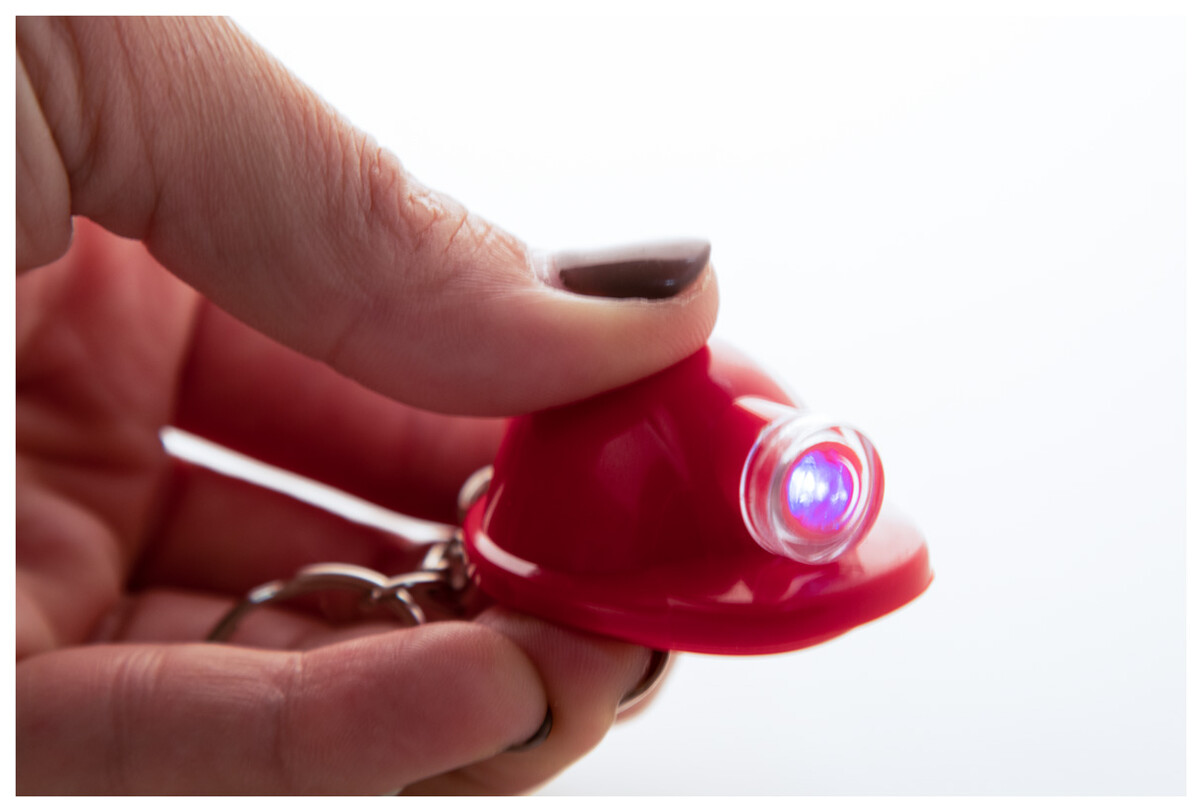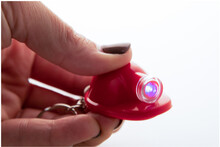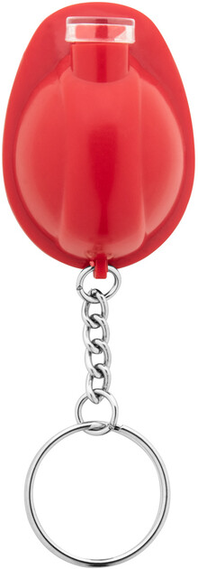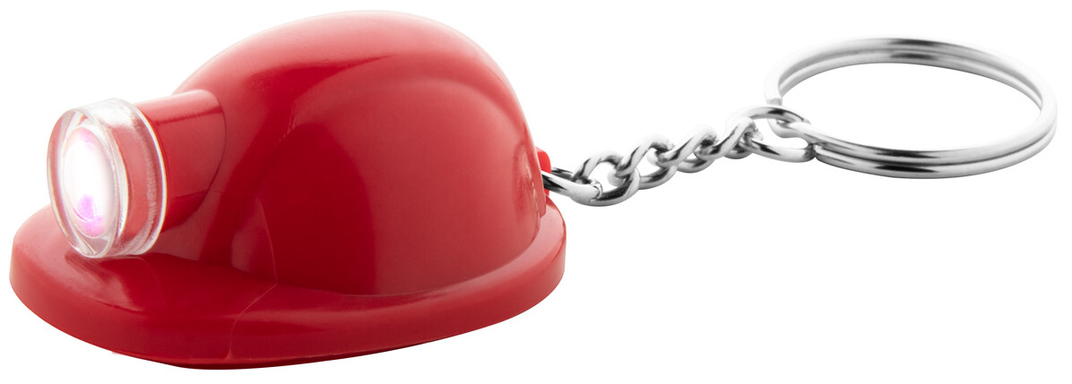 Plastový přívěšek na klíče ve tvaru přilby s LED svítilnou. S knoflíkovou baterií.