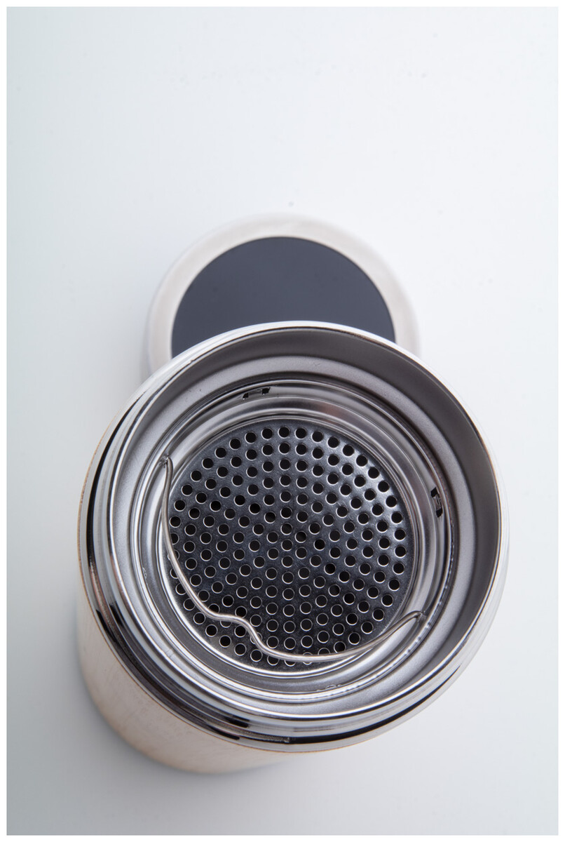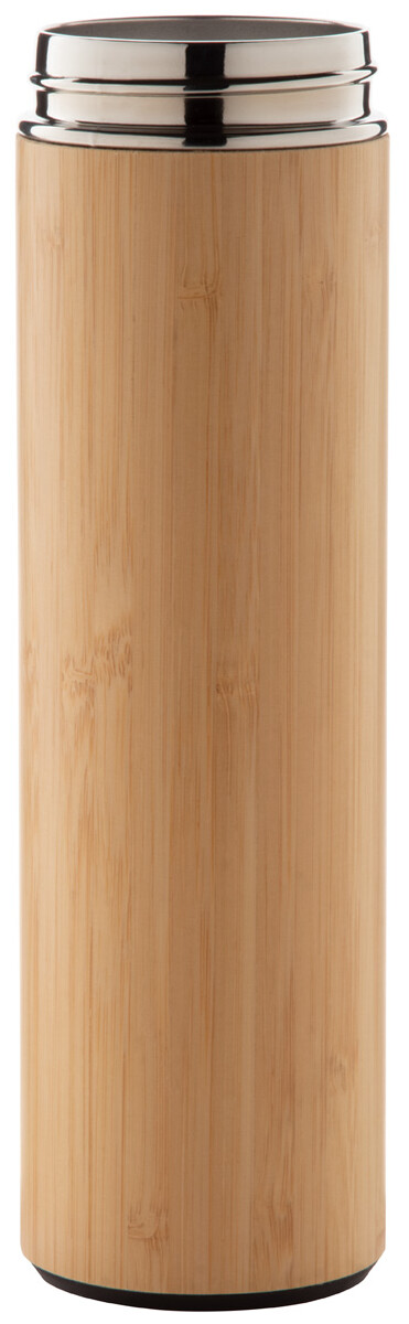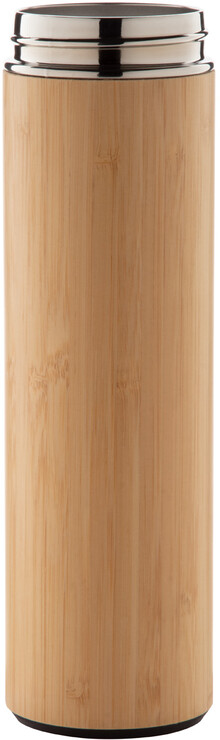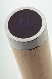 Dvoustěnná nerezová a bambusová termoska s čajítkem a dotykovým LED teploměrem na víčku. 500 ml. S knoflíkovou baterií.