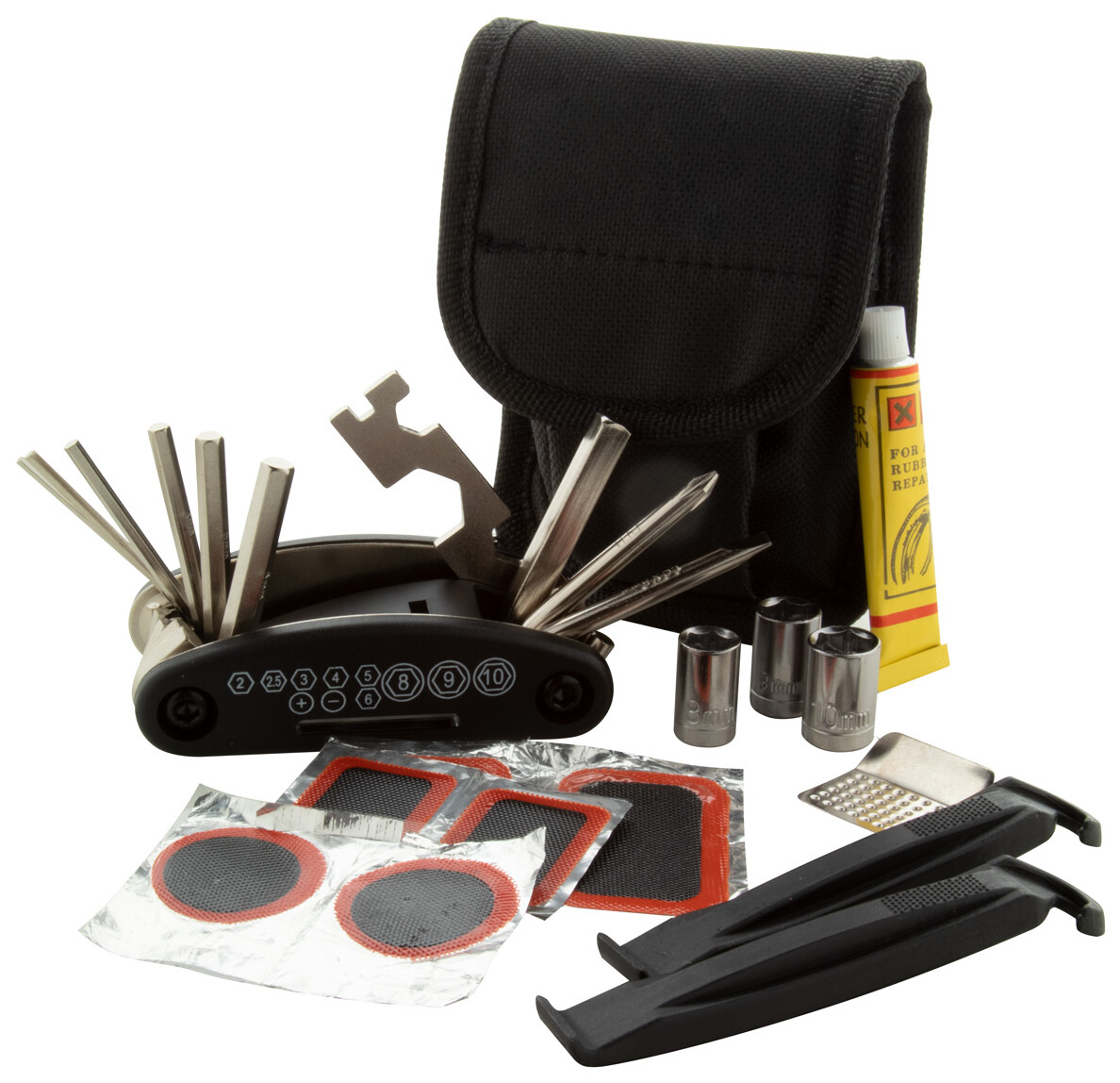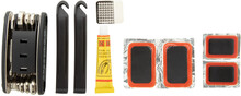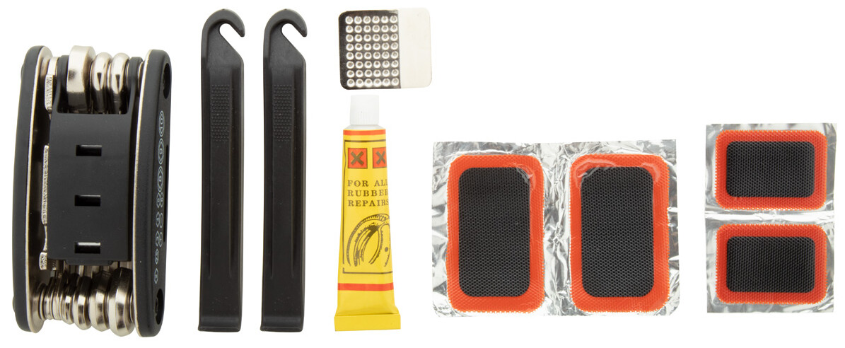 Sada nářadí na opravu jízdního kola v praktickém kufříku. Obsahuje: 15 funkcí multifunkčního nářadí a sady pro opravu defektu (2 páky na gumy, smirkový papír, lepidlo a 6 náplastí).