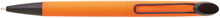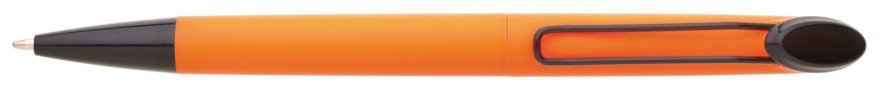 Plastová otočná propiska ARESTA v neonově oranžové barvě s černou špičkou a černým kovovým klipem. Na držák klipu je možné umístit epoxy samolepku. Náplň velkoobsahová, modře píšící.