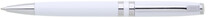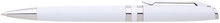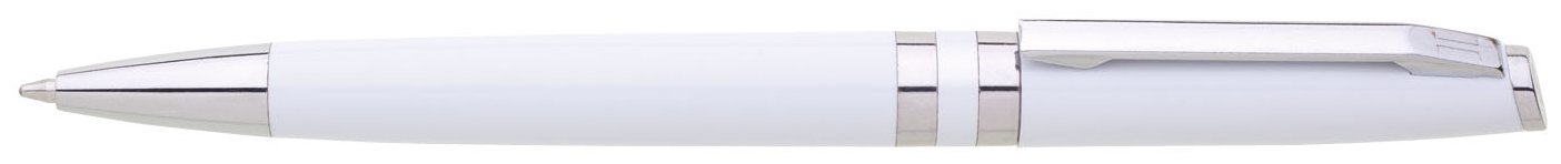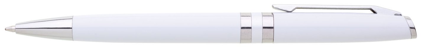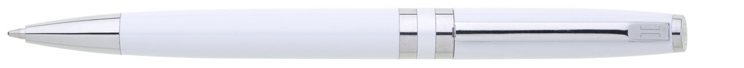 Varianta klasické propisky, bílé tělo je zdobené dvěma chromovými kroužky. Otočný mechanismus, náplň modře píšící.