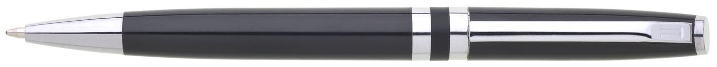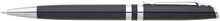 Varianta klasické propisky černé tělo je zdobené dvěma chromovými kroužky. Otočný mechanismus, náplň modře píšící.