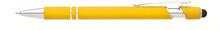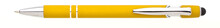 Propiska s touch koncem, měkkým pogumovaným soft povrchem ve žluté barvě a stříbrnými doplňky včetně dvou ozdobných kroužků. (NATIO)