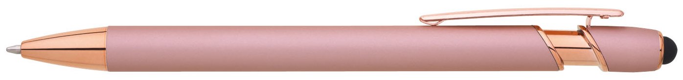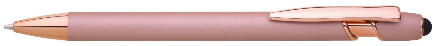 Kovová propiska se soft povrchem, touch koncovkou a doplňky v růžovo-zlaté barvě. Laserované logo je lesklé, růžovo-zlaté. Náplň modře píšící.