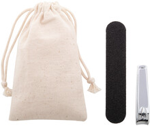 Sada na manikúru v bavlněném pytlíku se stahovací šňůrkou. Obsahuje pilník a nůžky na nehty.