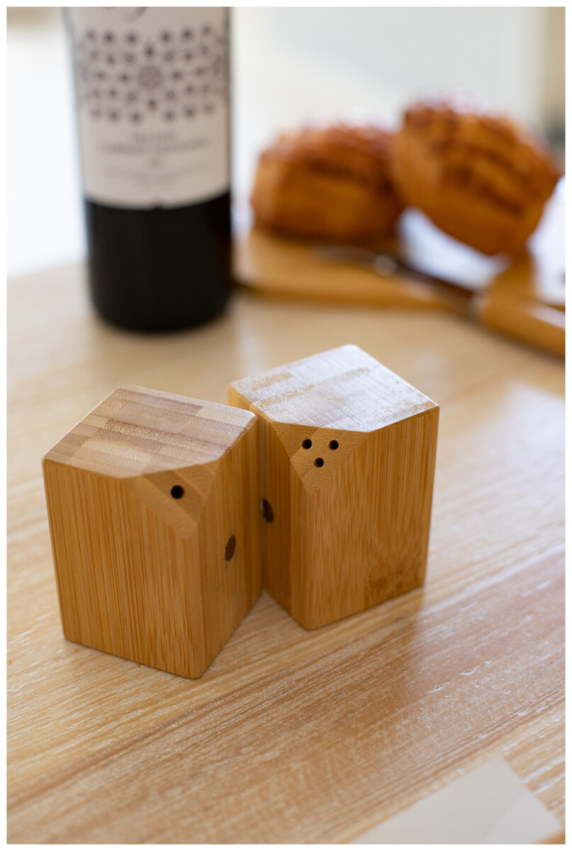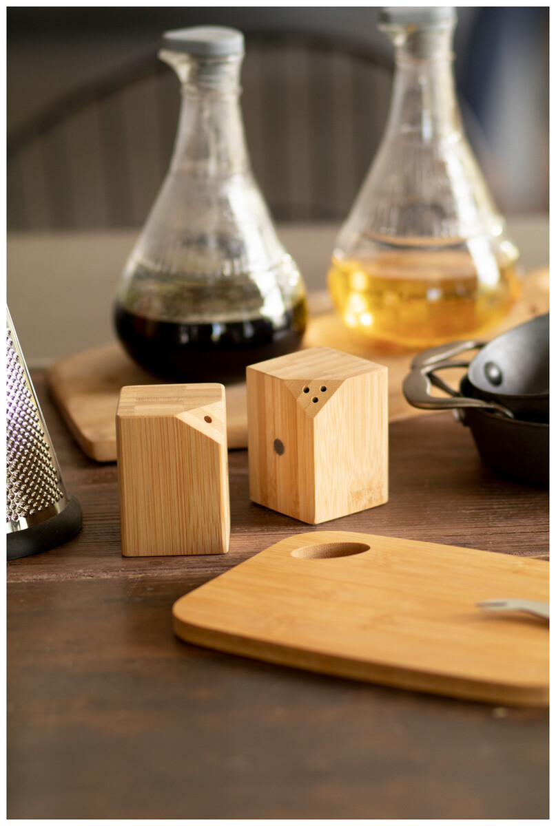 Sada 2 ks bambusové solničky a pepřenky. Sada je spojena ve středu díky magnetům umístěným na straně.