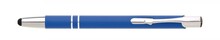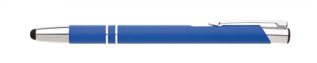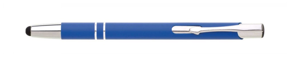 Hliníková propiska se stříbrnými doplňky a měkkým pogumovaným soft povrchem v modré barvě s touch špičkou..