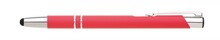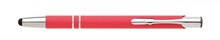 Hliníková propiska se stříbrnými doplňky a měkkým pogumovaným soft povrchem v červené barvě s touch špičkou..