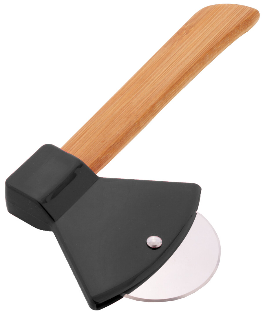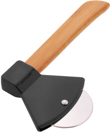 Kráječ na pizzu ve tvaru sekery s bambusovou rukojetí a čepelí z nerezové oceli.