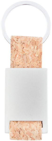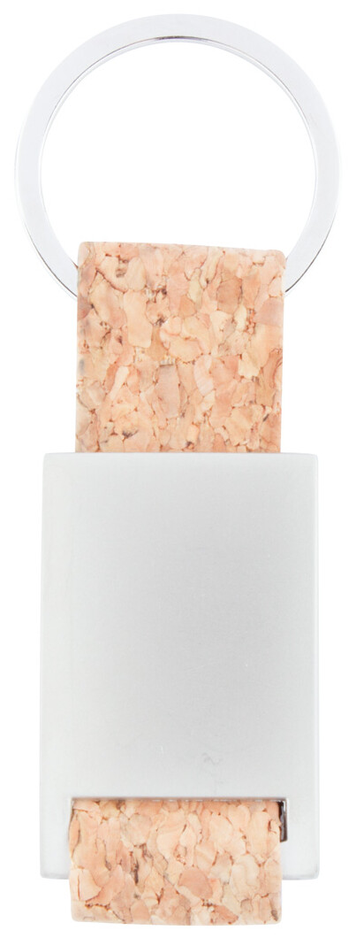 Obdélníkový kovový přívěsek na klíče s řemínkem z přírodního korku a kovovým kroužkem.