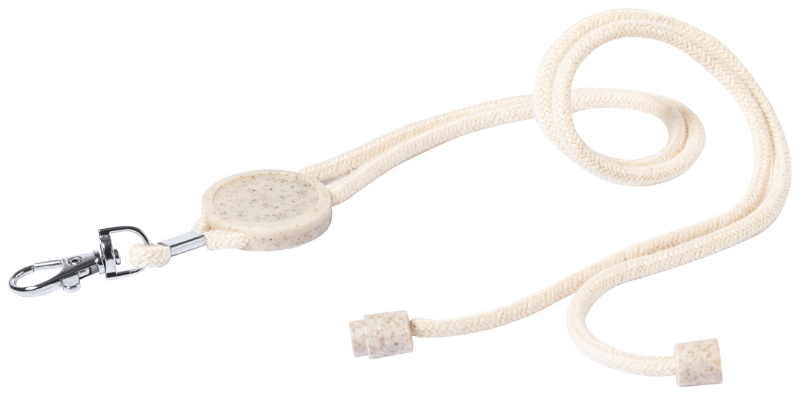 Bavlněný lanyard na krk s kovovou karabinou, bezpečnostní přezkou a kulatým štítkem z ekologické pšeničné slámy a ABS plastu. Ideální pro epoxy potisk.