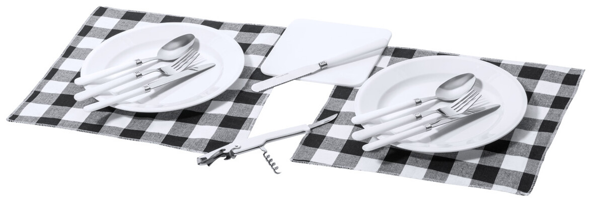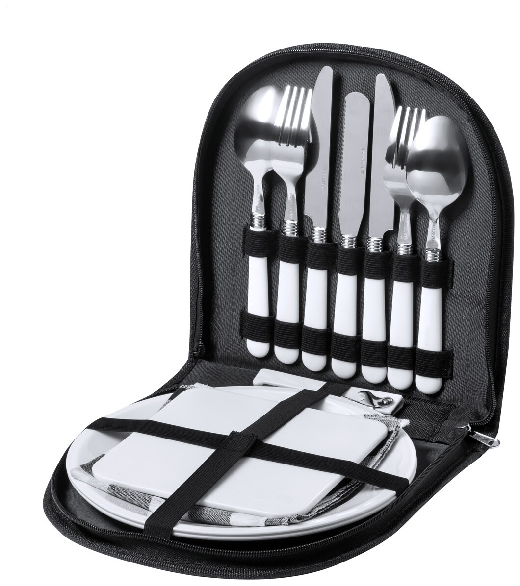 13dílná pikniková sada nádobí a příborů pro 2 osoby v přepravním kufříku z polyesteru 600D RPET na zip.