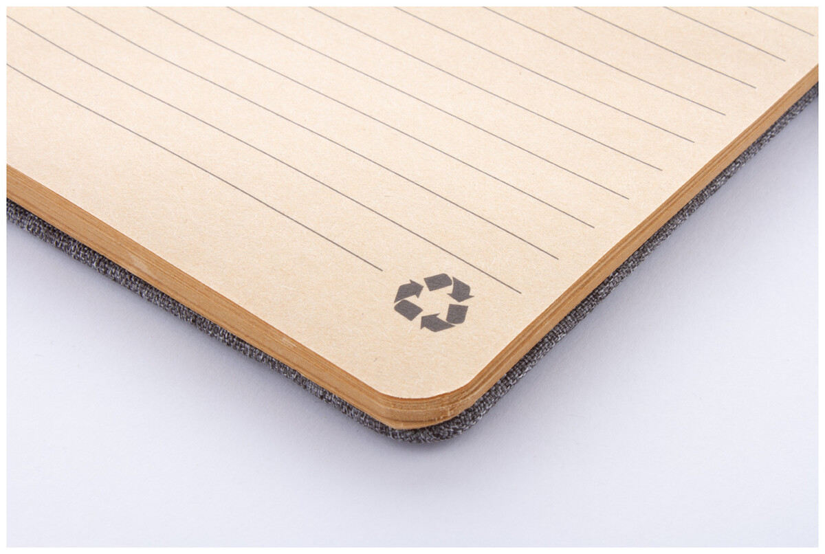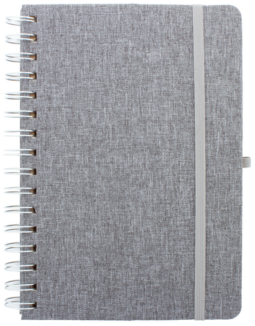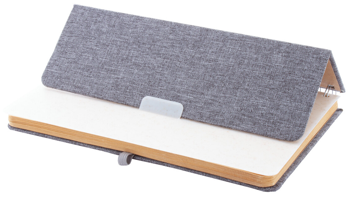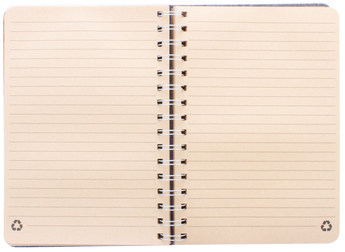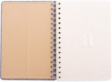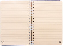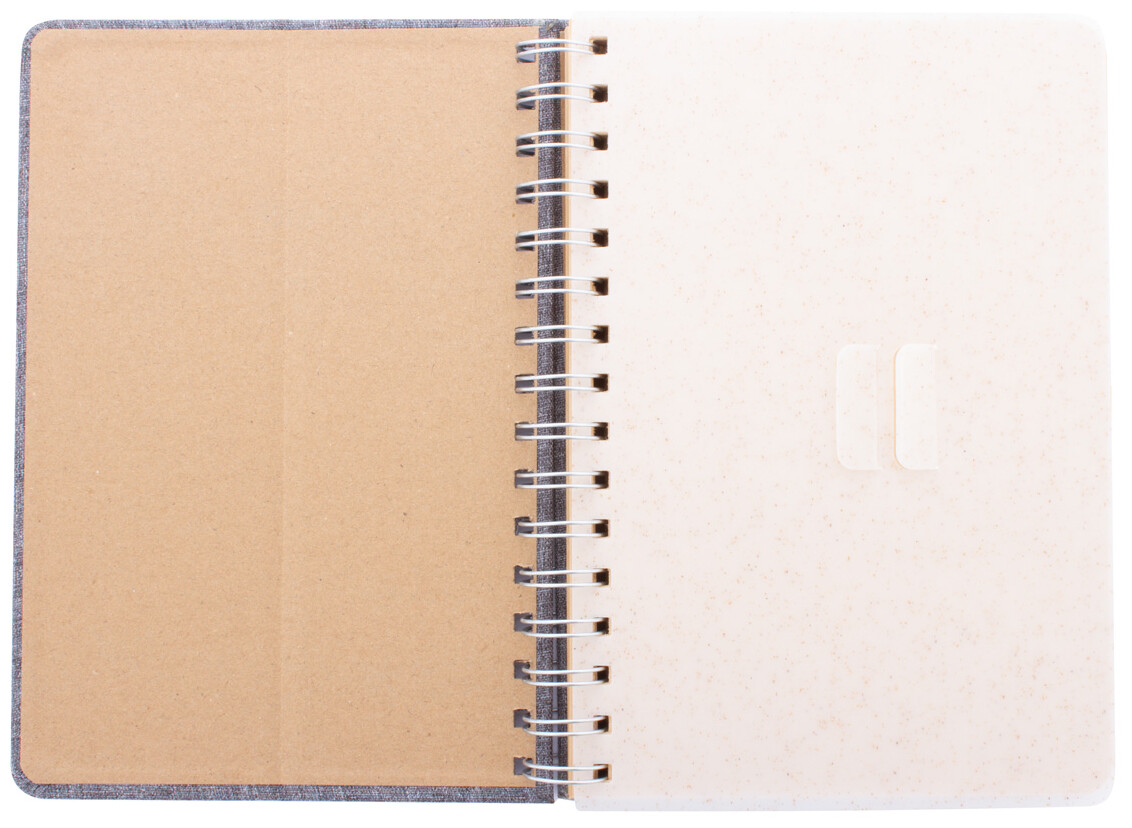 Spirálový blok A5 s deskami potaženými polyesterem RPET s plastovým držákem na mobil a tablet z pšeničné slámy. Se 70 linkovanými listy z recyklovaného kraftového papíru, gumičkou a držákem na pero.