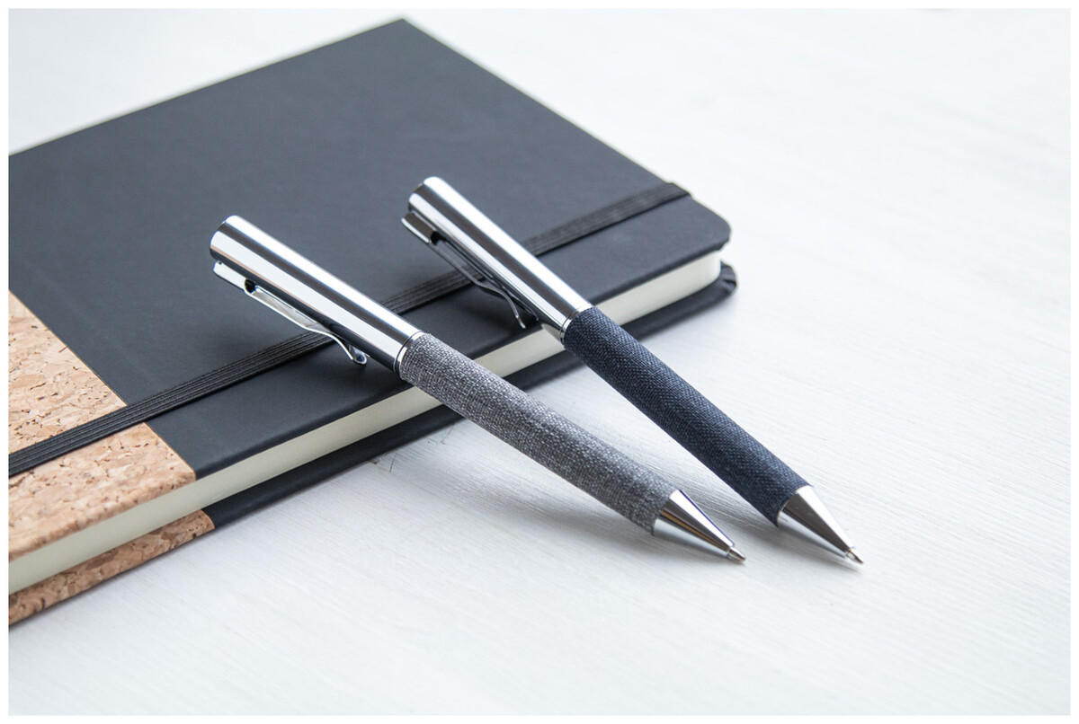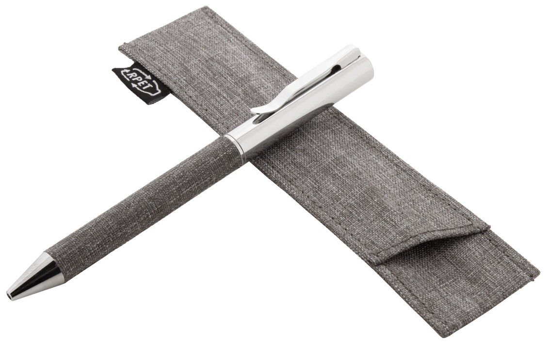 Kovové kuličkové pero s twist otočným mechanismem potažené polyesterem RPET. V odpovídajícím polyesterovém pouzdře RPET. S modrou náplní.
