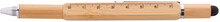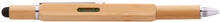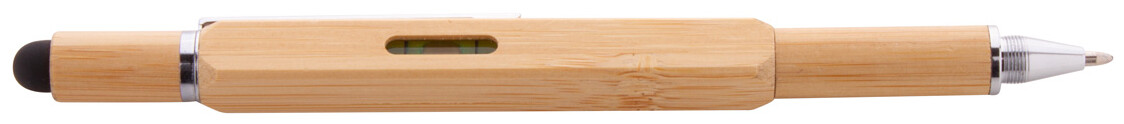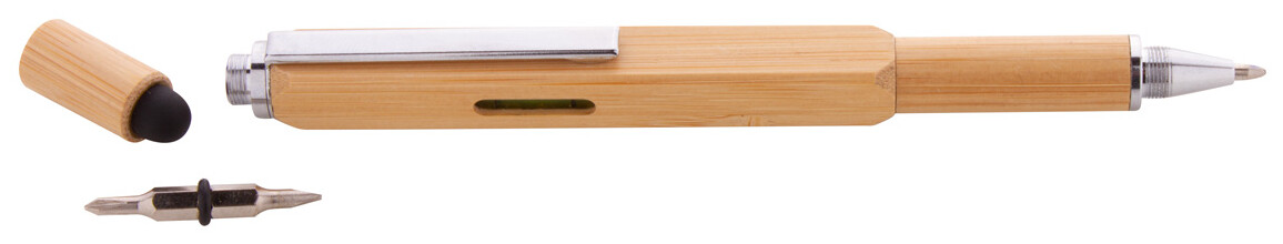 Multifunkční otočné kuličkové a dotykové pero z bambusu. S oboustranným šroubovákem, vodováhou a pravítkem 7 cm. S modrou náplní.