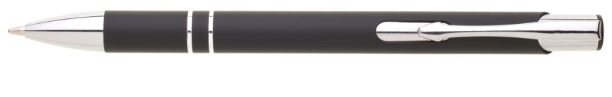 Hliníková propiska se stříbrnými doplňky a měkkým pogumovaným soft povrchem v černé barvě. Modře píšící.
