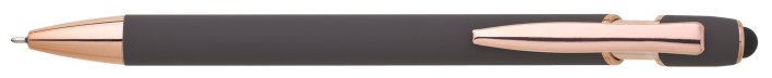 Kovová propiska se soft povrchem, touch koncovkou a doplňky v růžovo-zlaté barvě. Laserované logo je lesklé, růžovo-zlaté. Náplň semigelová, modře píšící.