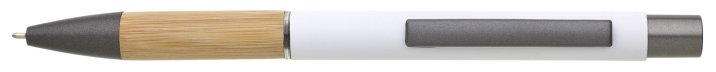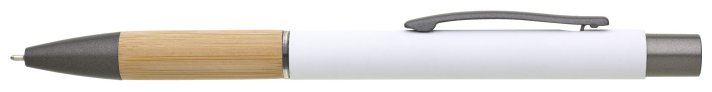Kovová propiska s hnědo-černými doplňky, pogumovaným povrchem a bambusovým úchopem. Náplň semigelová s mikrohrotem.