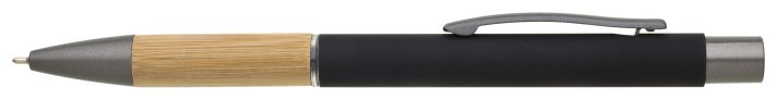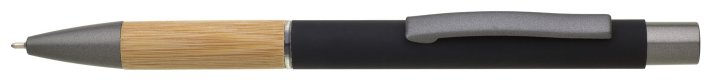 Kovová propiska s hnědo-černými doplňky, pogumovaným povrchem a bambusovým úchopem. Náplň semigelová s mikrohrotem.