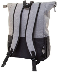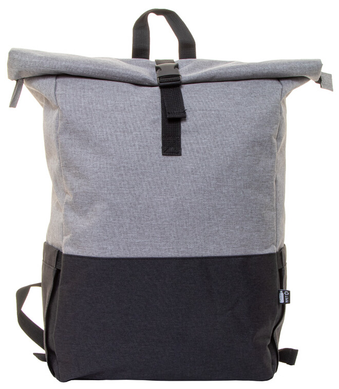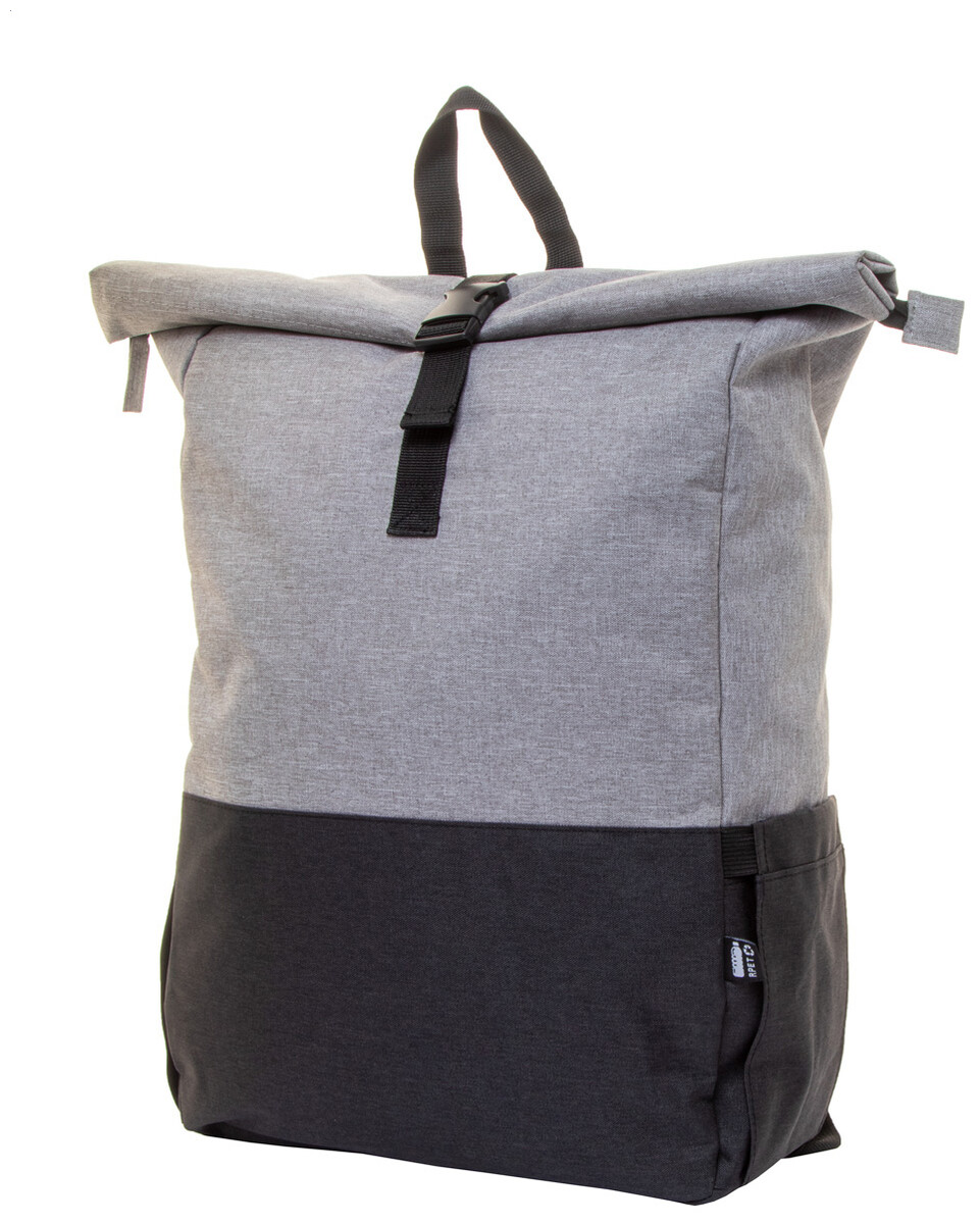 Dvoubarevný rolovací batoh z RPET se zapínáním na přezku, hlavní přihrádka na zip, polstrovaná přihrádka na notebook (15") a tablet (10"), boční kapsy, polstrovaná záda a ramenní popruhy. 300D RPET polyester s výrazným štítkem RPET.