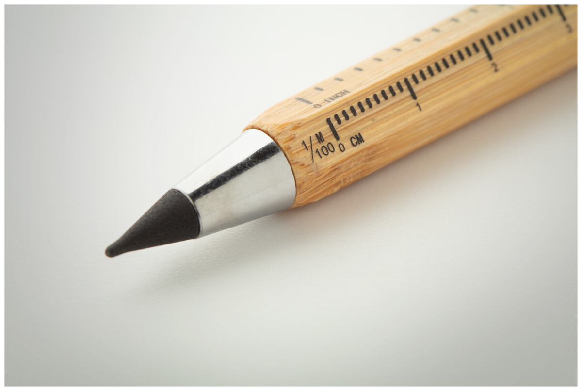 Bambusové bez inkoustové pero s dlouhou životností s dotykovým stylusem a hrotem z kovové slitiny, který oxiduje papír. S šestihrannou hlavní včetně pravítek 11 cm a 4 palce. Toto pero píše podobně jako tužka a navíc je stíratelné.