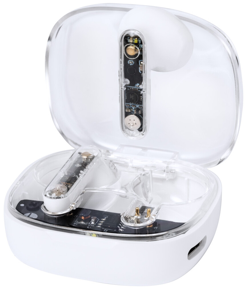 Poloprůhledná, skutečně bezdrátová stereofonní sluchátka (TWS) s viditelnými elektronickými součástmi a funkcí hands-free volání. V poloprůhledném plastovém pouzdře s nabíječkou. Včetně nabíjecího kabelu USB.