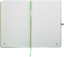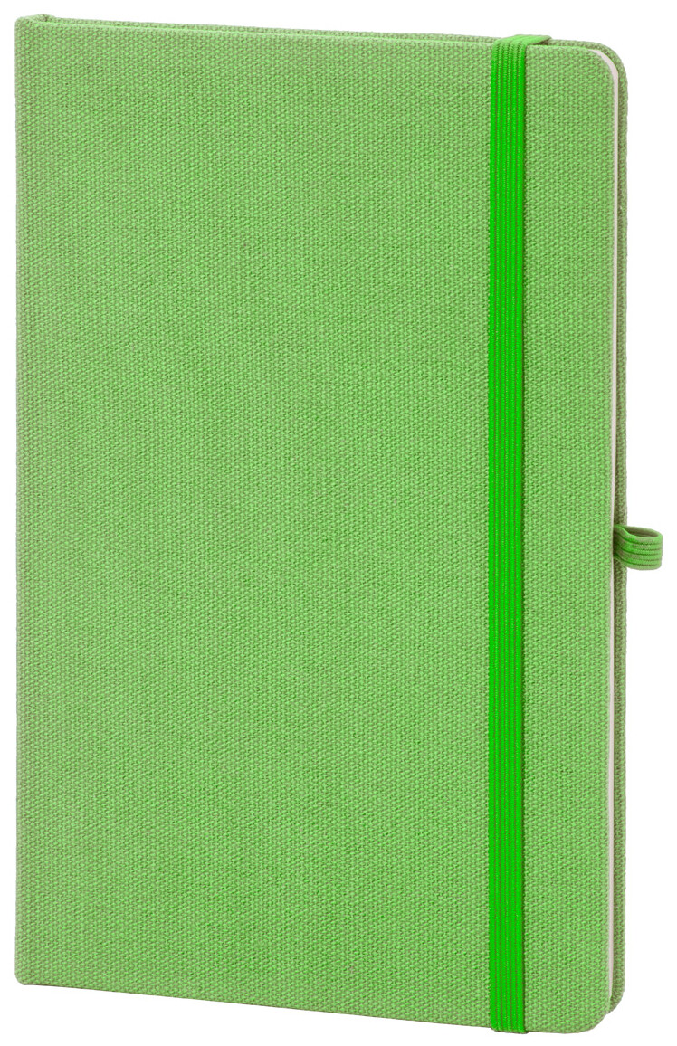 Blok potažený recyklovanou bavlnou s 80 linkovanými listy z recyklovaného papíru. Se záložkou v odpovídající barvě, gumičkou a držákem na pero. Velikost A5.