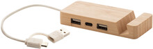 Bambusový USB hub s funkcí stojánku na mobil. Se 2 porty USB a 1 portem USB-C, USB 2.0. Včetně kabelu s připojením USB a USB-C.