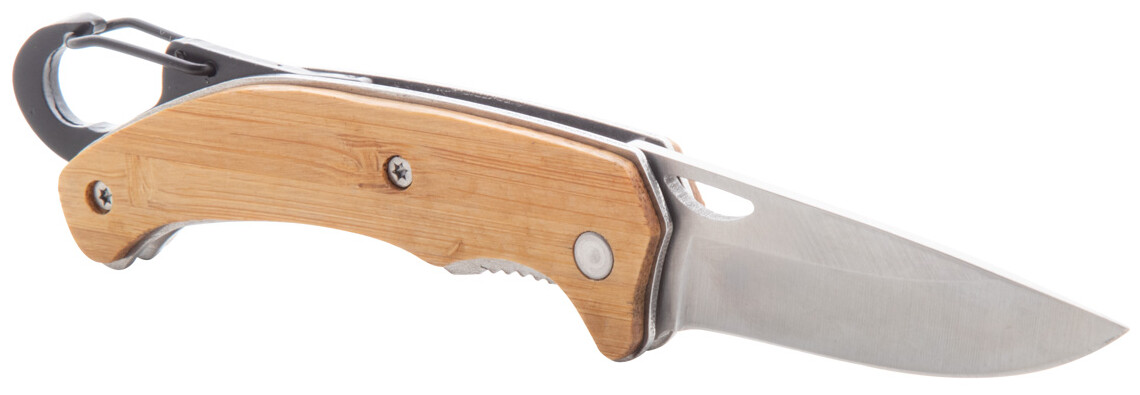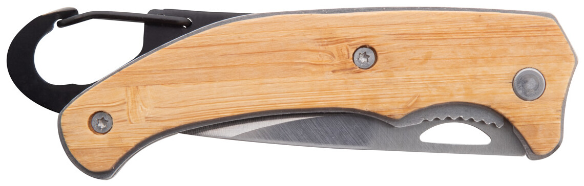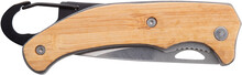 Kapesní nůž z nerezové oceli s bambusovou rukojetí a karabinou. S bezpečnostním zámkem.