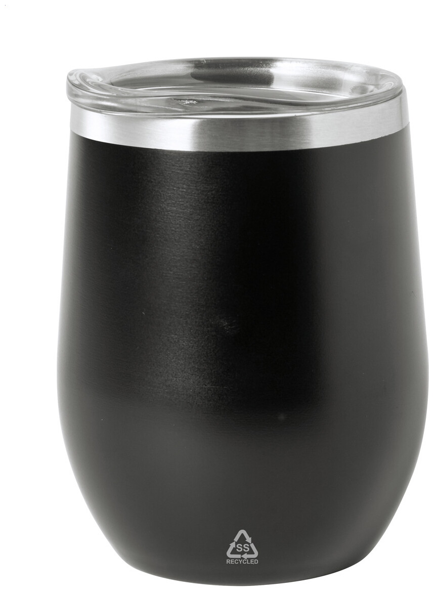 Dvoustěnný termo hrnek z recyklované nerezové oceli s plastovým víčkem na pití. 350 ml.