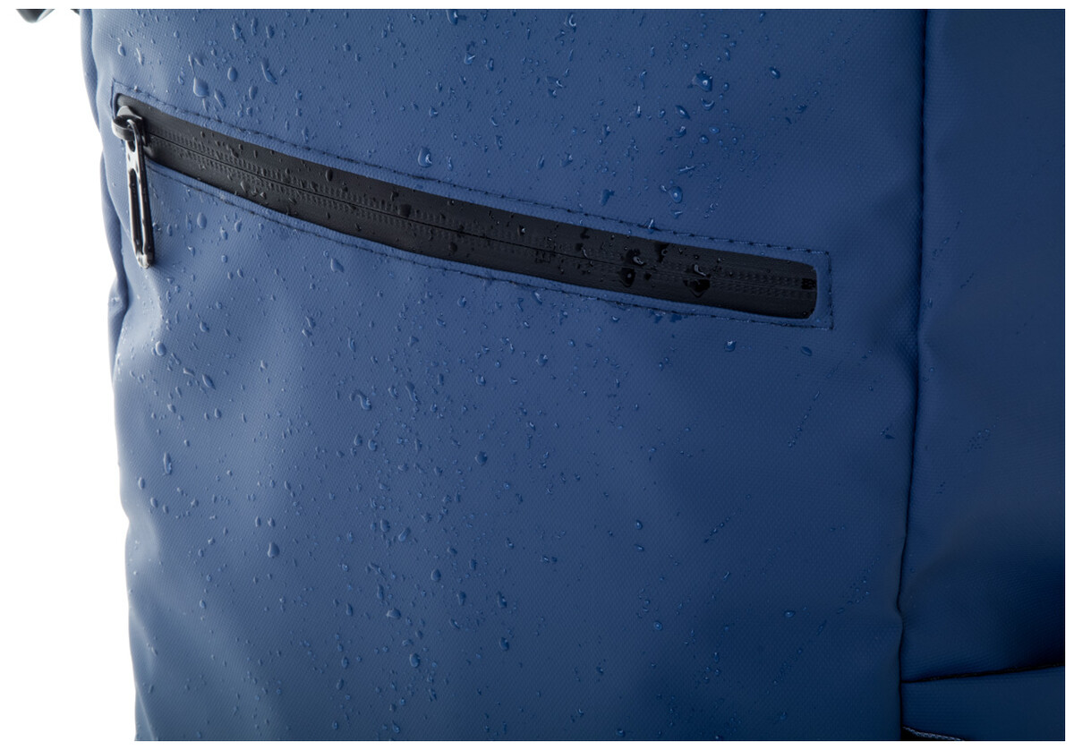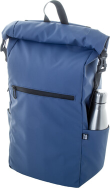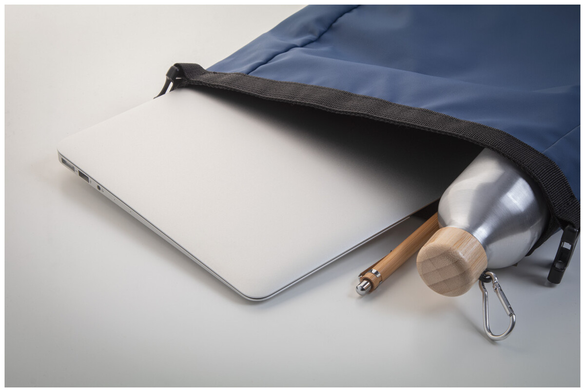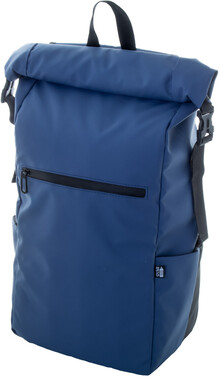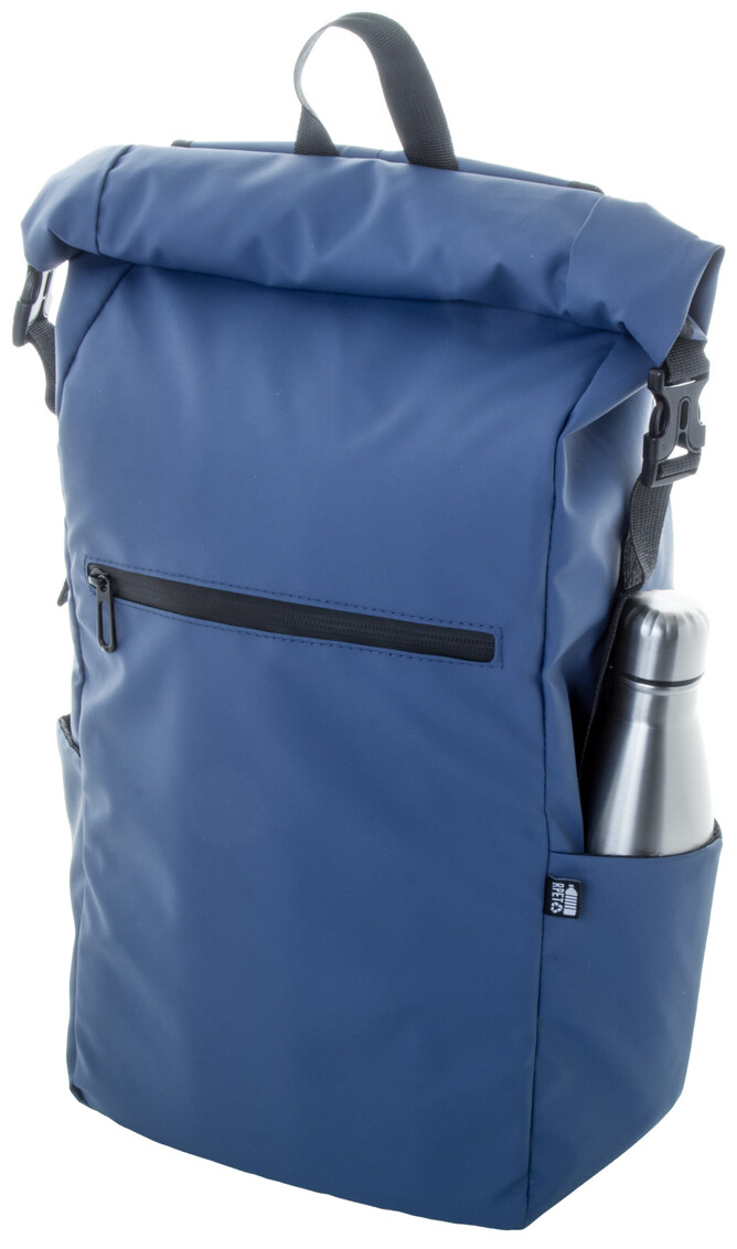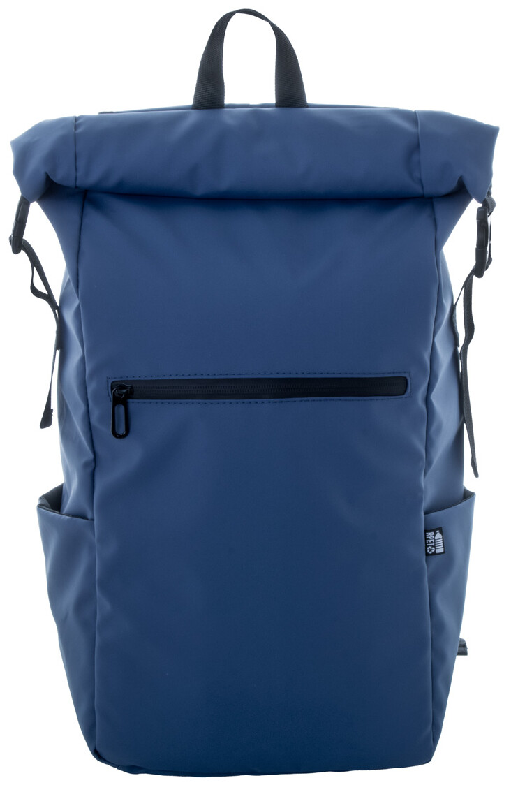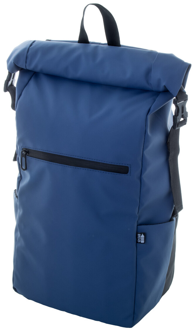 Vodotěsný rolovací batoh z RPET se zapínáním na přezku a suchý zip, polstrovaná přihrádka na notebook (16") a tablet (10"), přední kapsa na zip, boční kapsy, polstrovaná záda a ramenní popruhy. Polyester 600D RPET potažený PU, s výrazným štítkem RPET.