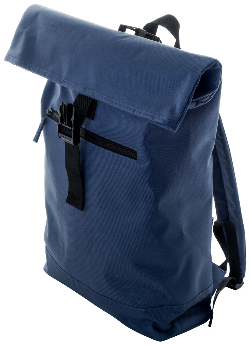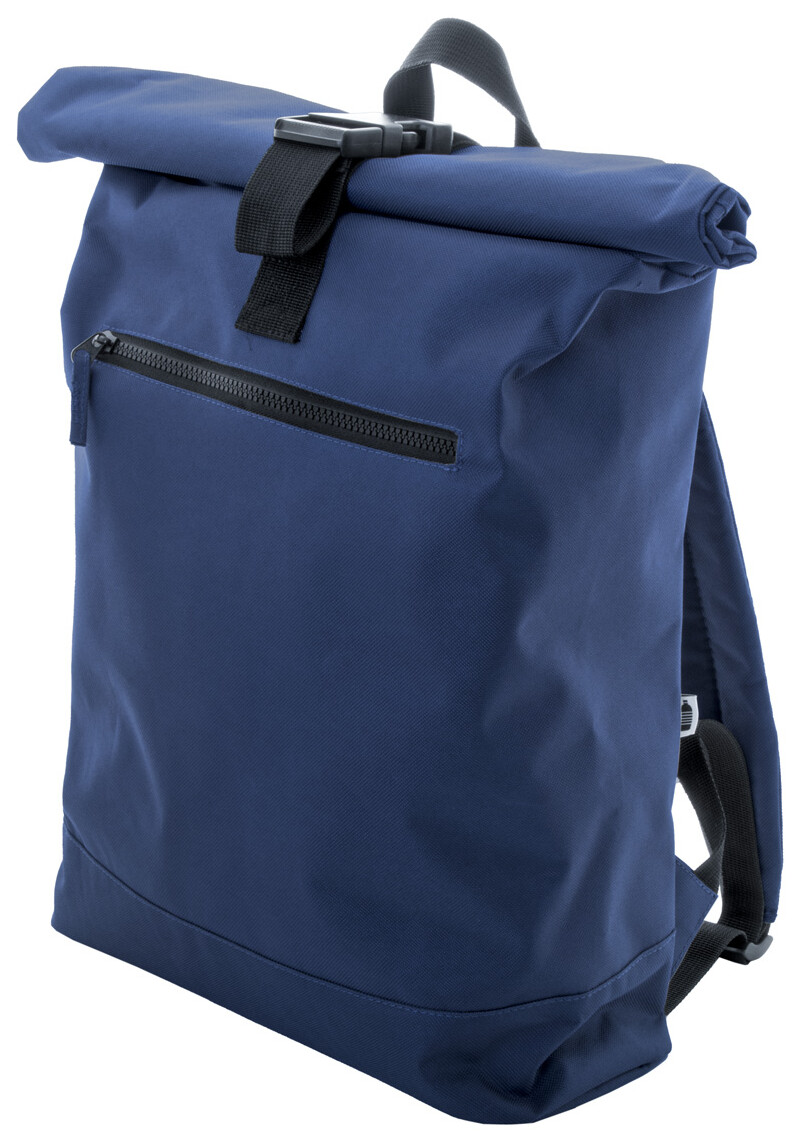Rolovací batoh RPET se zapínáním na přezku, přední kapsa na zip, polstrovaná přihrádka na notebook (15"), polstrovaná záda a ramenní popruhy. Polyester 600D RPET s výrazným štítkem RPET.