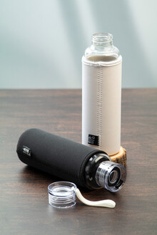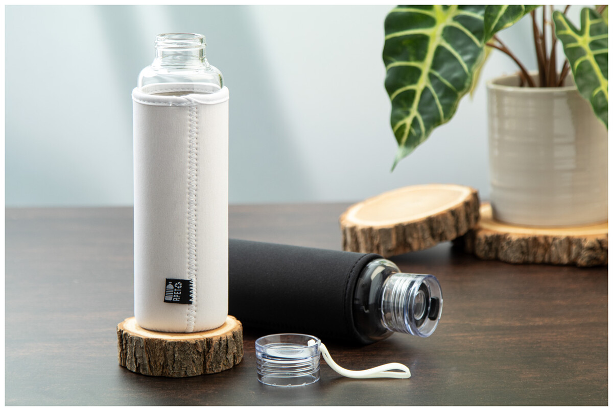 Láhev z recyklovaného skla s PS plastovým víčkem, silikonovým páskem a RPET neoprenovýmobalem, 550 ml. Nevhodné pro sycené nápoje.