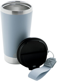 Dvoustěnný termo hrnek z recyklované nerezové oceli s víčkem na pití z PP a páskem na přenášení v odpovídající barvě. 430 ml.