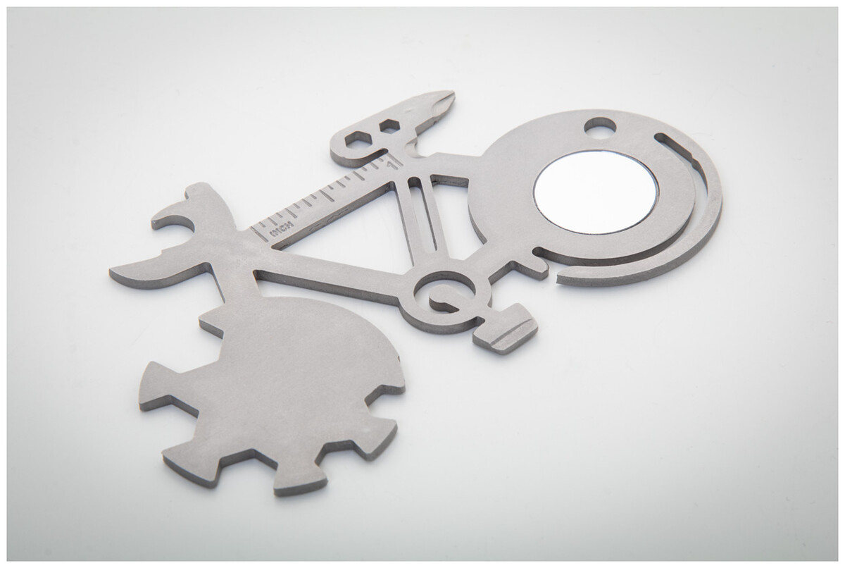 Multifunkční nářadí ve tvaru kola z nerezové oceli s 11 funkcemi.