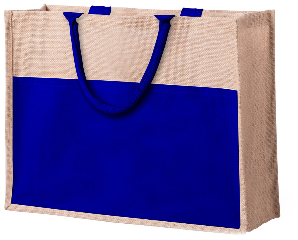 Plážová taška z laminované juty s bavlněnými uchy a přední kapsou.