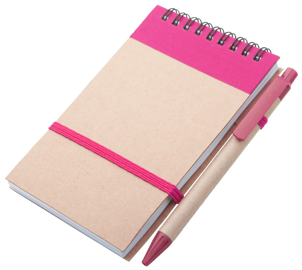 Blok ve spirále z recyklovaného papíru se 70 linkovanými listy a kuličkovým perem z recyklovaného papíru s modrou náplní. Velikost A6.