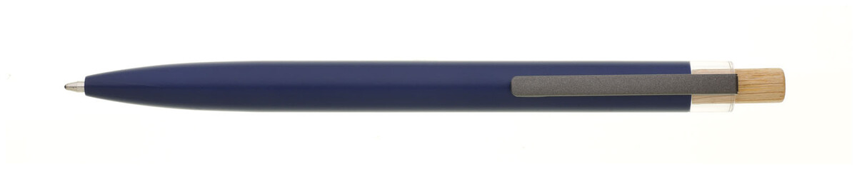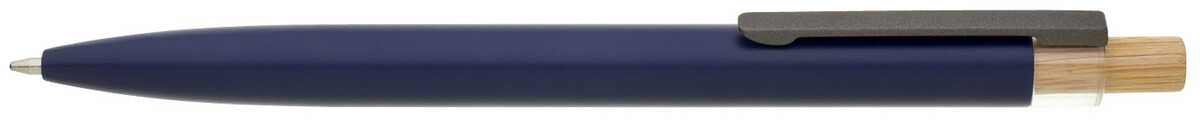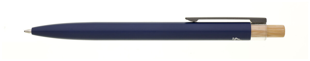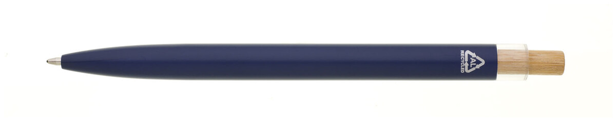 Modrá designová kovová propiska z recyklovaného hliníku. Tmavý kovový klip je uchycen v ozdobné transparentní koncovce, doplněné bambusovým cvakátkem. Náplň velkoobsahová, modře píšící. Kolekce SAVE THE NATURE.