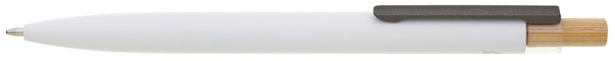 Bílá designová kovová propiska z recyklovaného hliníku. Tmavý kovový klip je uchycen v ozdobné transparentní koncovce, doplněné bambusovým cvakátkem. Náplň velkoobsahová, modře píšící. Kolekce SAVE THE NATURE.