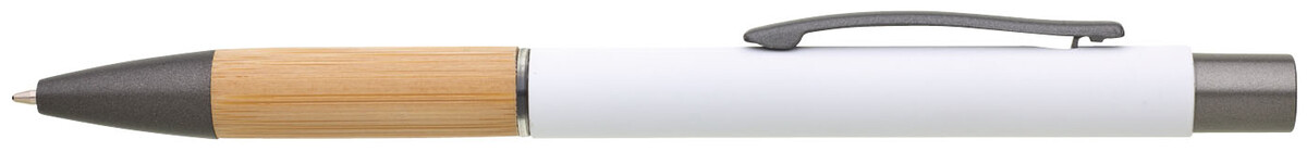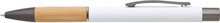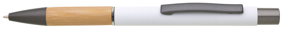 Kovová propiska s hnědo-černými doplňky, bílým pogumovaným povrchem a bambusovým úchopem. Náplň VO modře píšící. Kolekce SAVE THE NATURE.