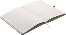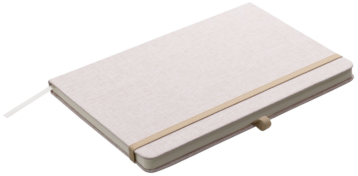Zápisník A5 v deskách potažených béžovou látkou z recyklované bavlny má 80 linkovaných listů. Blok má uzavírací gumičku, poutko na propisku a textilní záložku v přírodní barvě.