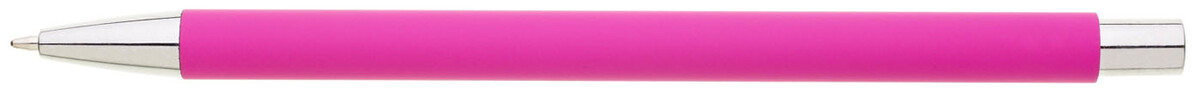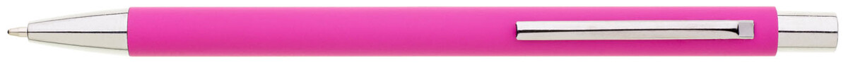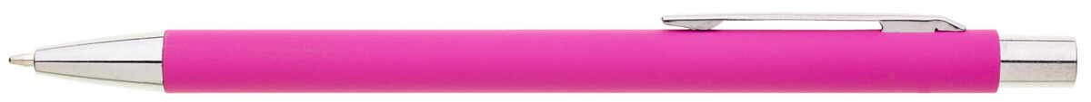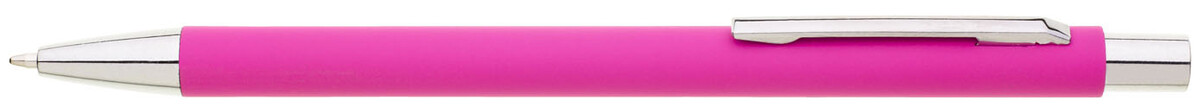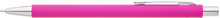 Tenká, jednoduchá propiska s růžovým pogumovaným tělem a chromovými doplňky. Náplň X20, modře píšící.