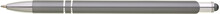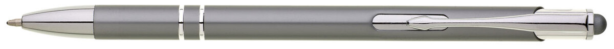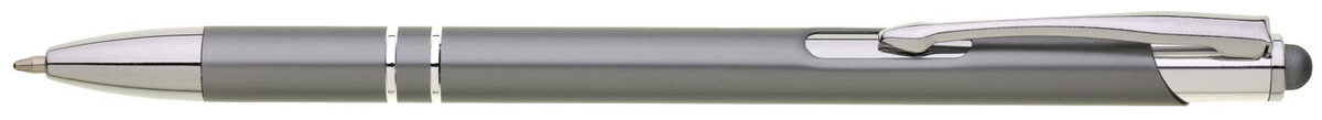 Tenká šedá hliníková propiska s chromovými doplňky a touchem v barvě těla. Náplň X20 modře píšící.